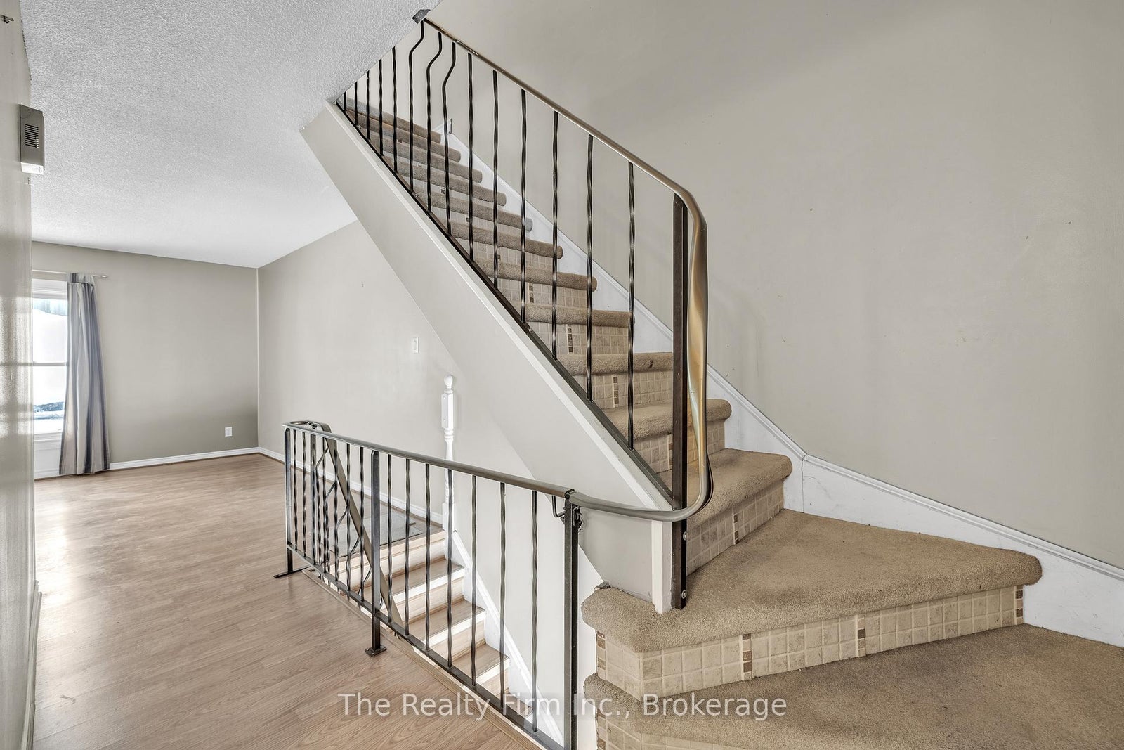 An affordable freehold townhouse in a central Woodstock location - a great place to start, invest, or reset.This 3-bedroom, 2-bath home offers a functional layout with a single-car garage and good size yard. Ground level has garage and laundry, second floor (main) features a bright living and dining area, a galley-style kitchen, and a convenient 2-piece bath. Upper floor has three bedrooms, including a good-sized primary and two additional rooms ideal for a single bed and dresser, all with proper closets, plus a full 4-piece bathroom. The home is clean and ready, some fresh cosmetic work will go a long way in bringing the space back to where it needs to be. Great project for a do-it-yourselfer or someone looking to learn while building equity. The compact kitchen helps keep renovation costs manageable. A metal roof (2019), no condo fees, and low property taxes keep ownership affordable. A solid entry-level opportunity for first-time buyers, investors, or anyone starting fresh.